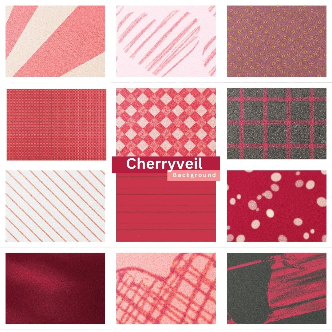 Step into the charm of Cherryveil, a cheerful collection of 12 patterned backgrounds inspired by shades of cherry red, blush pink, and soft rose tones. Each design combines geometric shapes, heart motifs, and flowing gradients — evoking warmth, sweetness, and a touch of nostalgic fun. The result is a collection that feels lively, modern, and delightfully expressive.