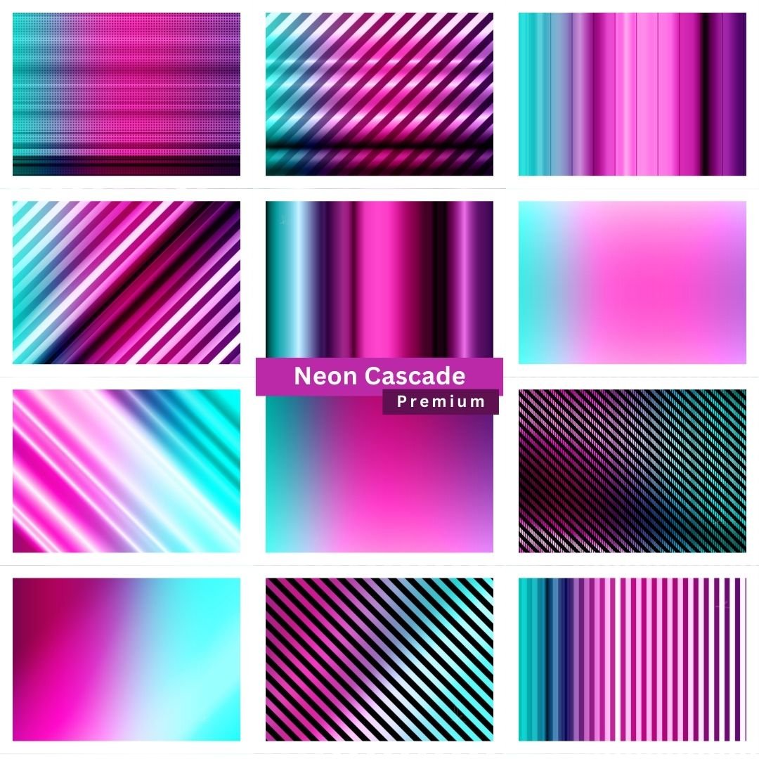Step into the glow of the future with Neon Cascade, a curated collection of 12 electrifying backgrounds that blend vivid magentas, radiant cyans, and deep purples into cascading gradients and dynamic light streaks.