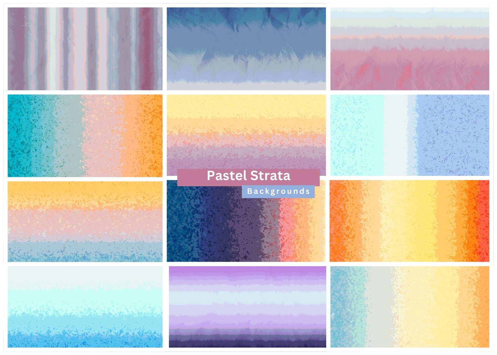 Immerse yourself in the gentle layering of Pastel Strata, a curated collection of 12 abstract backgrounds inspired by natural color strata, soft horizons, and harmonious transitions. Each design features stacked pastel bands, smooth gradients, and delicate grain textures, blending lavender, peach, mint, sky blue, butter yellow, and dusty rose tones to create visuals that feel calm, airy, and subtly expressive.